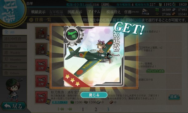 任務報酬の受領状況、予定。 秋刀魚漁:「秋刀魚」を収獲する所存です! 4尾所持 特注家具職人x1 戦闘糧食x4(選択済み) ネジは定期任務があるけど、家具職人はこういう任務くらいでしかもらえない。三式水中探信儀、探照灯は実際どれを選んでもって感じだった。秋刀魚漁:「秋刀魚」を収獲する所存です! 秋刀魚漁:漁を全力で支援する覚悟です! 他 これらの任務により、資源や装備、そして一七式大漁旗を獲得可能です! 鎮守府カウンタバー「秋刀魚」料理modeに移行秋刀魚漁:「秋刀魚」を収獲する所存です! 秋刀魚漁:漁を全力で支援する覚悟です! 他 これらの任務により、資源や装備、そして一七式大漁旗を獲得可能です! 13 鎮守府カウンタバー「秋刀魚」料理modeに移行